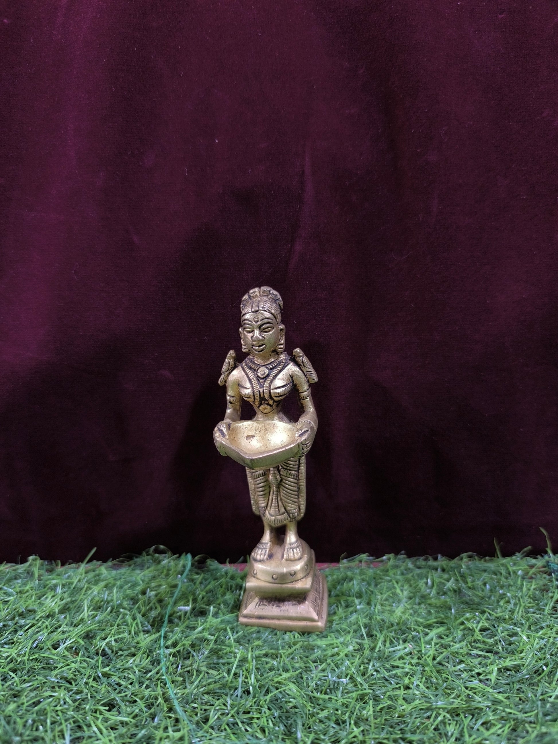 This idol is a Brass Standing Lady with a Bowl (lakshmi / Lakshmi Statue).It is a traditional South Indian brass idol where the lady (Lakshmi form) is shown holding a bowl or deepam (lamp). Such idols are usually placed in pooja rooms, temple entrances, or as decorative showpieces.