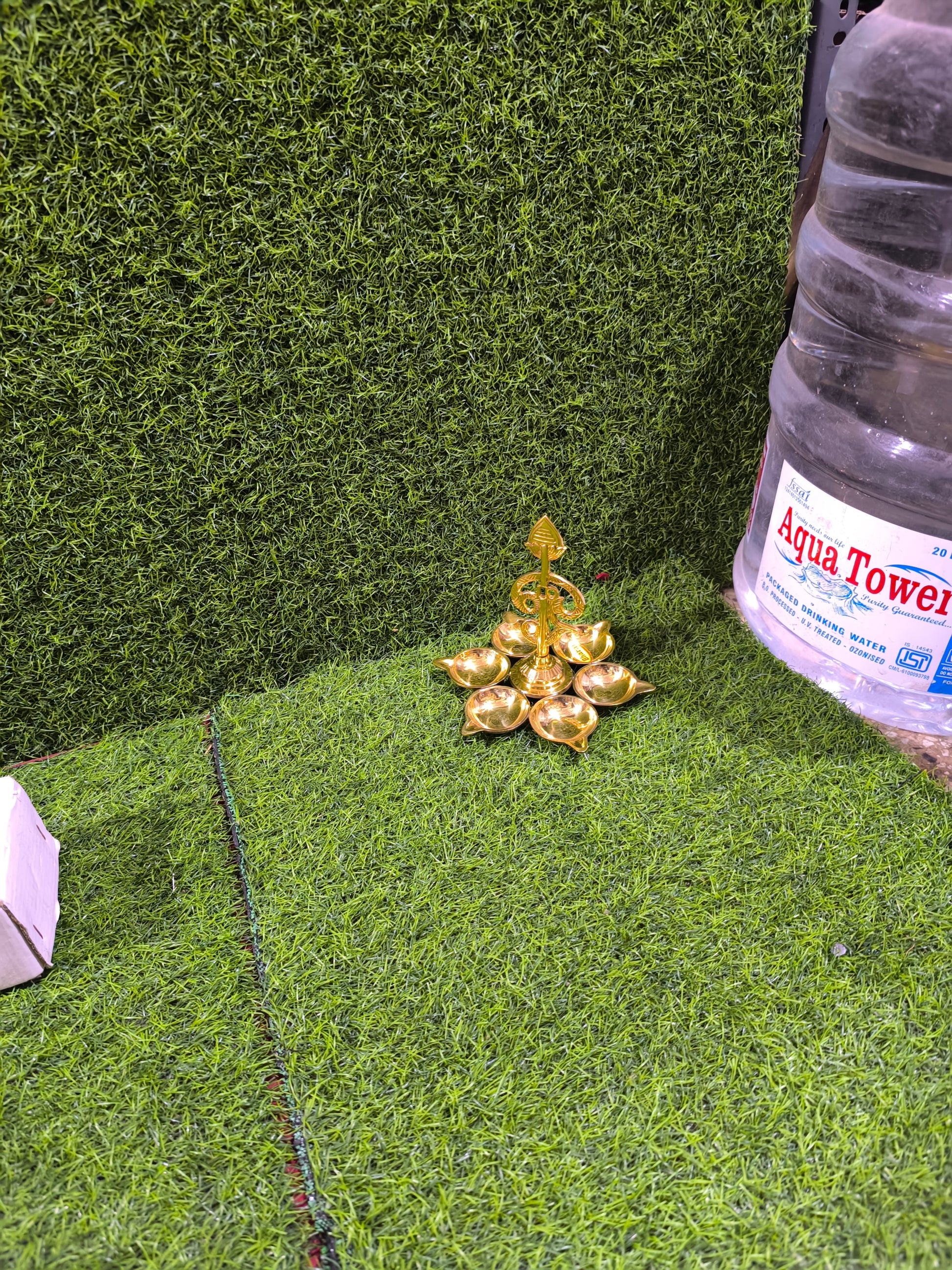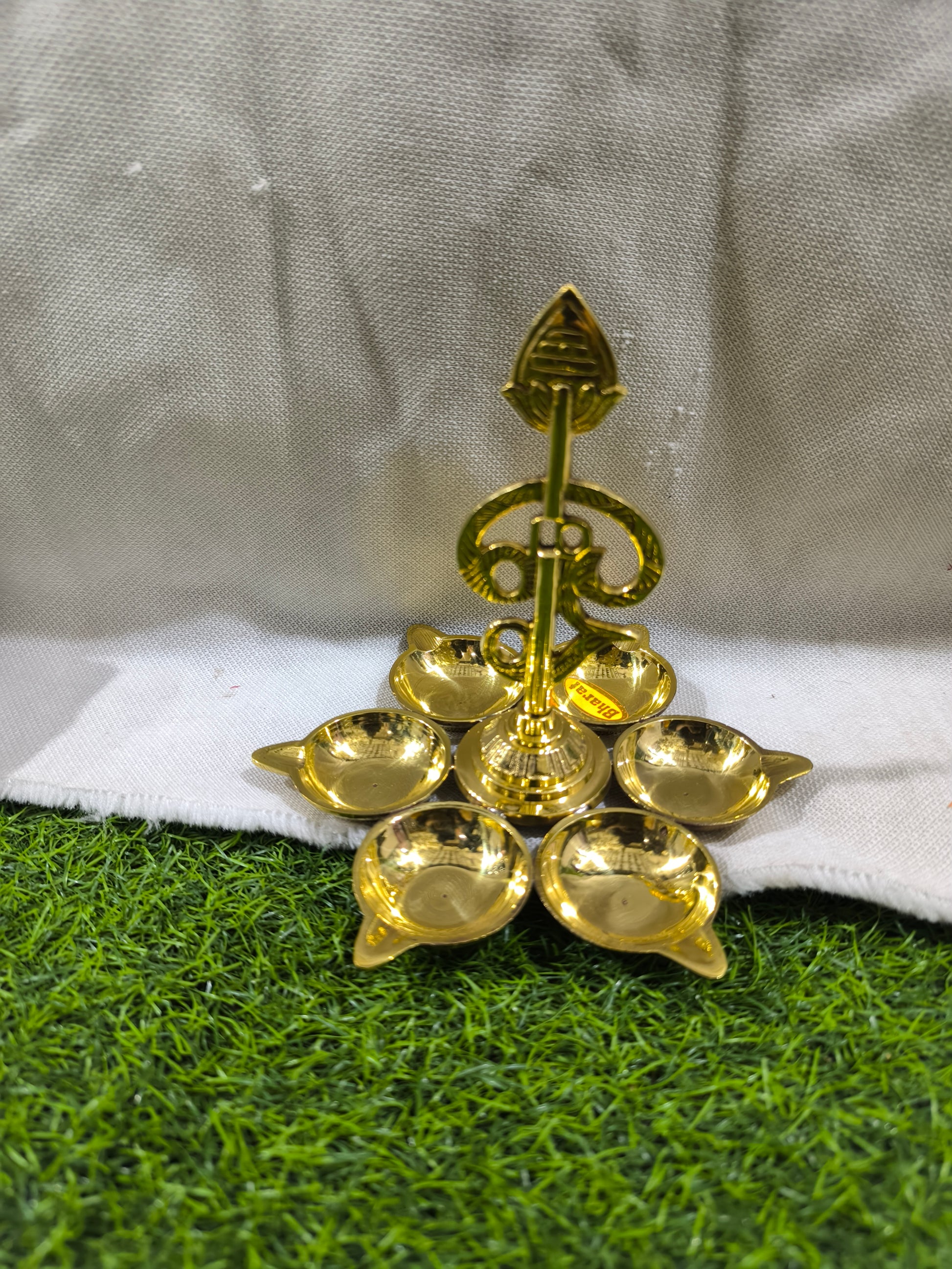 Brass Om Shankh Trishul Diya Stand (6-Wick Design)