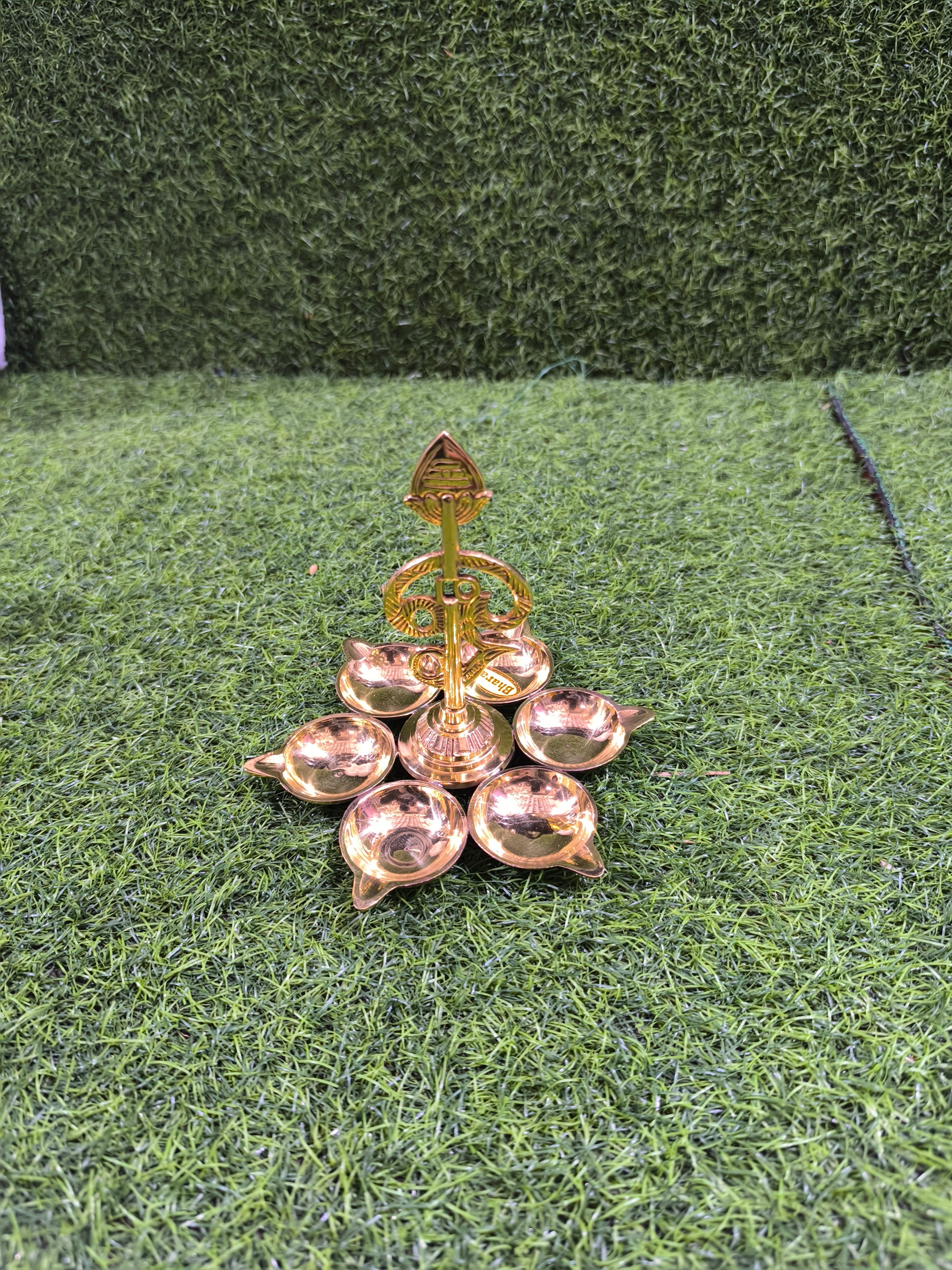 A beautifully handcrafted brass diya stand featuring 6 oil lamps arranged in a floral pattern. The centerpiece showcases an intricate design with the sacred Om symbol, a Shankh (conch), and a Trishul (trident) on top, symbolizing purity, protection, and divine energy. Perfect for puja rituals, Diwali celebrations, Navratri, or as an auspicious home décor piece.