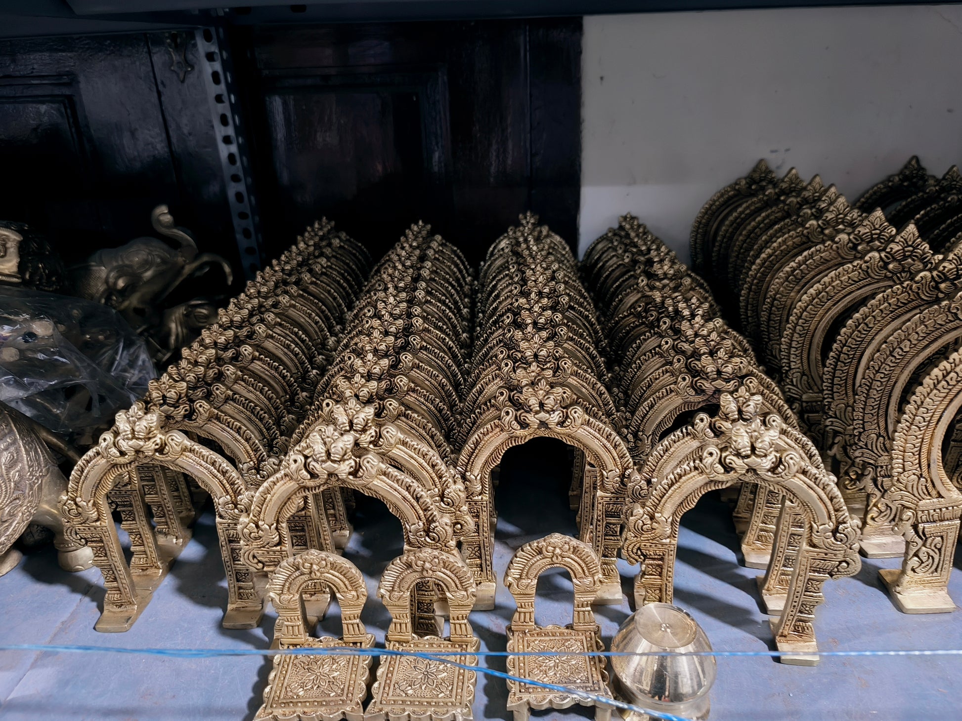 This picture shows beautiful brass Prabhavali (arches/frames/toranas) which are traditionally placed behind idols of gods & gods & goddesses as a divine backdrop. Bring divine grandeur to your idols with this handcrafted brass prabhavali (temple arch). The intricate carvings represent sacred motifs of traditional Indian temple architecture. Perfect for enhancing the aura of idols like Lord Vishnu, Ganesha, Lakshmi, or any deity, making them ideal for home temples, gifting, and pooja purposes. Crafted from solid brass, these prabhavalis are durable, long-lasting, and highly polished to give a temple-like appearance.